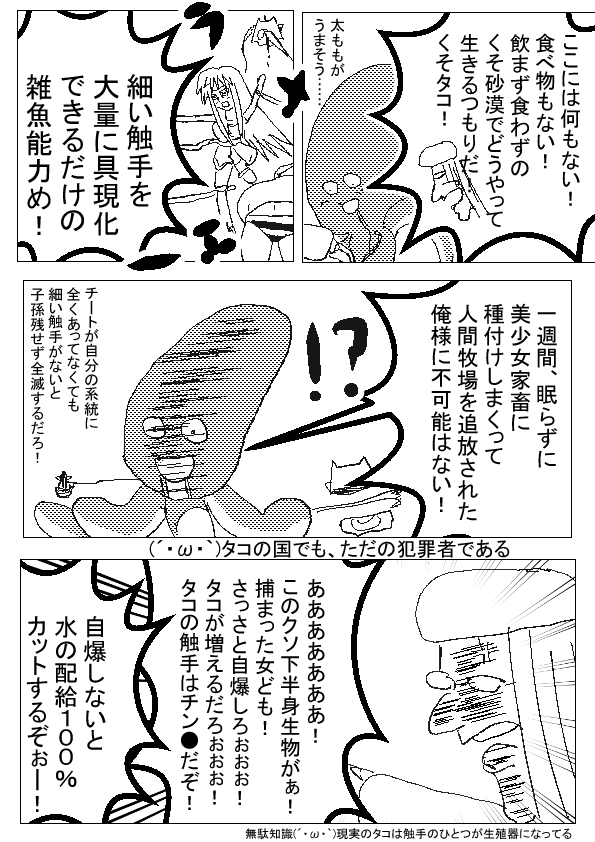 8 件のコメント : (´・ω・`)パルメ2019年7月27日 17:37 (´・ω・`)ようやく次で戦闘シーンでござる (ノ゜ω゜)(ノ゜ω゜)一日20ページ描くんだ! 返信 匿名2019年7月27日 17:48 どの選択肢が選ばれたのか想像できへん 返信 返信 (´・ω・`)パルメ2019年7月27日 20:24 (´・ω・`)今回エルフィンでてない (´・ω・`)パルメ2019年7月27日 20:39 (ノ゜ω゜)(ノ゜ω゜)こら!?先生ぇ! 前の話で、エルフィンがどの選択肢を選んだのか、読者に非公開だろ! (´・ω・`)(なる ) 匿名2019年7月27日 20:40 他のプレイヤーの集落か...。 略奪しがいありそうだ (´・ω・`)パルメ2019年7月27日 21:32 (´・ω・`)他のプレイヤーの集落か……あるんじゃろうか……? (ノ゜ω゜)(ノ゜ω゜)あったとしても、情報的に断絶している場所か、オークの所にでもいるんじゃ……? 母体を虐待すると、子供を虐待するだろうし…… 返信 匿名2019年7月27日 21:18 砂漠でタコって生きられるの? 30分もしないうちに干物になりそうだけど。 返信 返信 (´・ω・`)パルメ2019年7月27日 21:30 (´・ω・`)生命力しゅごいから、水があればワンチャンス (ノ゜ω゜)(ノ゜ω゜)相手を絶望させるためにウンコ大統領が叫んでるだけで、戦場、岩山の中だし、水あるし、本人は生き残れないけど、子供だけは量産できるんだよなぁ…… 復活地点ばれたら、復活した傍から、次々と餌食になる訳だし |