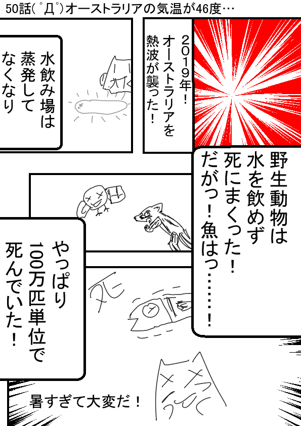 | きつねっこ日記 50話 ( ゚Д゚)オーストラリアの気温が46度……生物、生存できるんか……? |
