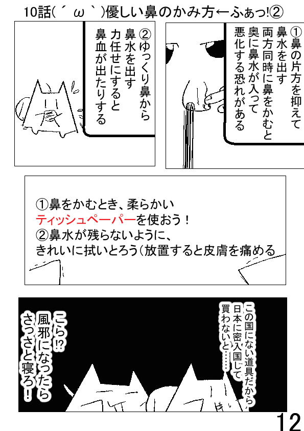 ★★★ ーー ★(ノ゜ω゜)(ノ゜ω゜)先生ぇー!優しい鼻のかみ方ってなんだー! -- †(´・ω・`)鼻水って、華にホコリとかの異物が入ってきたから、それを体の外に出すために、鼻水が出るじゃろ? ーー ★(ノ゜ω゜)(ノ゜ω゜)そういう仕様なんですね -- †(´・ω・`)鼻水を出す時に、鼻の片方を抑えていると、効率よく鼻水が出るぞい そんで力を入れずに、ゆっくりと空気を鼻から吐けば、OKじゃ ーー ★(ノ゜ω゜)(ノ゜ω゜)……鼻の両方から、鼻水出しちゃ駄目なの? -- †(´・ω・`)鼻水が奥の方に移動して、悪化する可能性があるらしい。 ーー ★(ノ゜ω゜)(ノ゜ω゜)力強く、息に鼻水出しちゃ駄目なのは? -- †(´・ω・`)鼻を傷つけて、鼻血が出ることがあるらしい…… ーー ★(ノ゜ω゜)(ノ゜ω゜)なんで、この漫画描いた? -- †(´・ω・`)風邪ひいてつらい…… ーー ★(ノ゜ω゜)(ノ゜ω゜)現在の心境かよ!? -- †(´・ω・`)鼻水をたくさんだして、健康ライフじゃ! ーー ★(ノ゜ω゜)(ノ゜ω゜)風邪ひいている時点で、説得力が皆無だ!? -- |