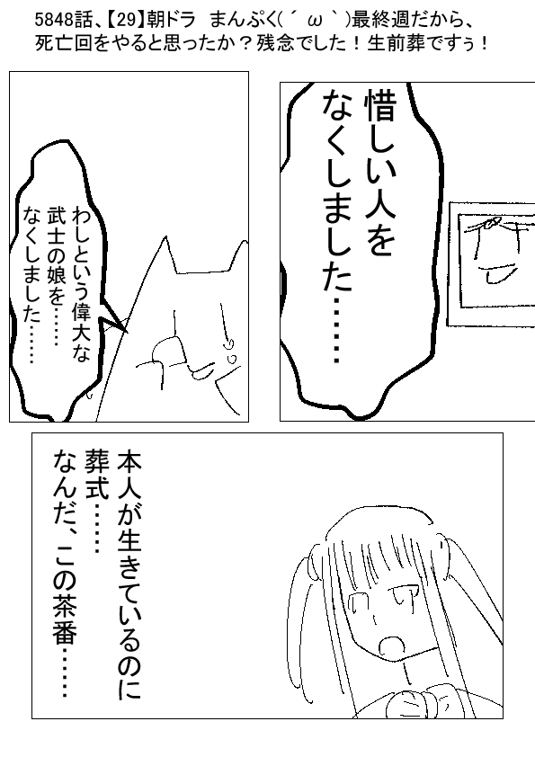 先週の予告「葬式」 ↓ 今週 主人公の母(´;ω;`)生きている間に葬式やりたいー! 生きている時に、どれくらい、自分の存在がありがたい存在なのか知りたいー! 主人公「ふぁっ!?」 ★★★ -- ★(ノ゜ω゜)(ノ゜ω゜)先生ぇー!生前葬だぁー!? -- ●( ´ ω ` )(葬式の費用が、2回かかって大変じゃな) -- ★(ノ゜ω゜)(ノ゜ω゜)親戚とか、集まるのか……?生前葬に……? -- ●( ´ ω ` )さぁ……? -- ★(ノ゜ω゜)(ノ゜ω゜)大抵、ここらへんで主人公死亡して、今まで死んだキャラがたくさんでてくる幽霊回やるのが朝ドラですけど……まさか、生前葬ネタをやるとか……誰が予想しました? -- ●( ´ ω ` )わしは武士の娘ですぅ! 生前葬やりたいですぅ! -- ★(ノ゜ω゜)(ノ゜ω゜)やめろ!?キャラのセリフをパクるな!? -- |