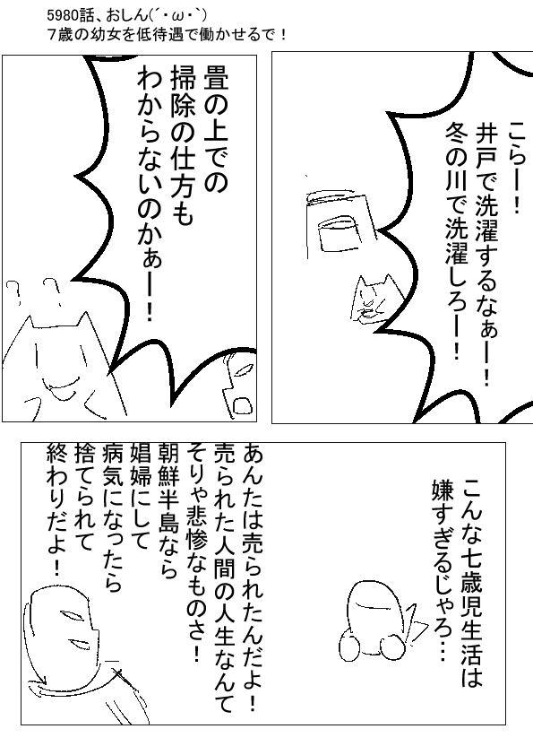 先輩「なに、元気なさそうにしているんだ! さっさと働け!」 おしん(´;ω;`)貧しいから親と離れ離れ……文字の読み書きできないから連絡もできない…… 先輩「ご飯は一膳だけ残しといたよ!残飯を食べな! 畳の上での掃除の仕方も知らないのかい!?」 おしん(´;ω;`)畳もない貧民だもん…… 洗濯物は井戸でいい? 先輩「馬鹿やろー!川で洗えぇー!井戸は綺麗にしないと、飲み水で汚染されるだろうがぁー!」 おしん(´;ω;`)冬の川で洗濯とか辛い…… ★★★ -- ★(ノ゜ω゜)(ノ゜ω゜)先生ぇー!こんなに辛いのかぁー!? 明治時代の東日本の人らはぁー! -- ●( ´ ω ` )(安く買い叩かれる作物ばっかり量産して、経済的にウンコだったけ……) -- ★(ノ゜ω゜)(ノ゜ω゜)実際の所、これ本当の話だと思う? -- ●( ´ ω ` )経済がぶっ壊れた国の農家とか「なんでアンタ産まれたの!さっさと死ねばいいのに!」状態らしいからのう…… それと比べればワンチャンス? -- ★(ノ゜ω゜)(ノ゜ω゜)こらー!?そんなのと比較するな!? -- |