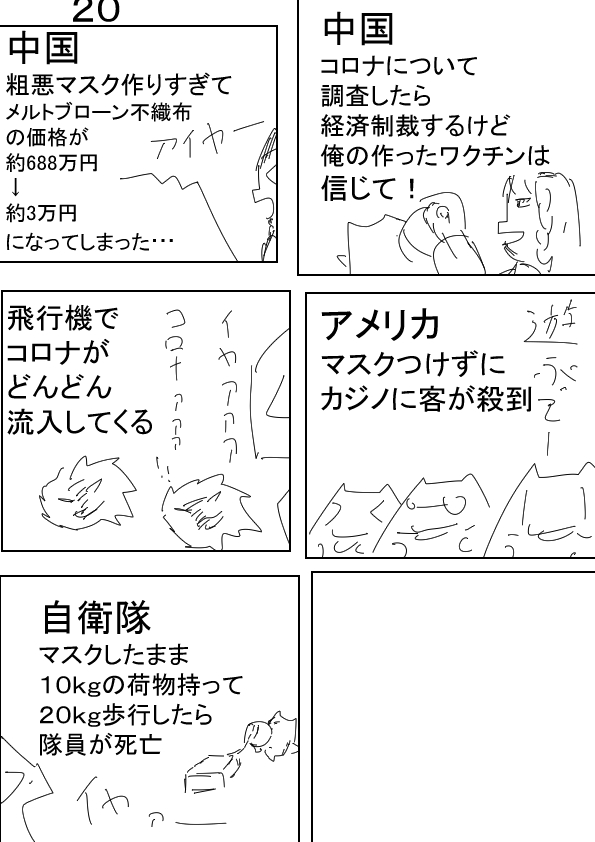 | ●7 件のコメント : 匿名2020年6月11日 11:56 呼吸しにくい上に蒸れる。そこに暑さが加わってまさに地獄。 返信 返信 (´・ω・`)パルメ2020年6月11日 17:18 (´・ω・`)うむ、しかも20キロの移動じゃしな… (ノ゜ω゜)(ノ゜ω゜)しかも、年が年だし… 返信 匿名2020年6月11日 12:17 網目の荒い濡れタオルですら顔に押し付ければ死ぬんだから、網目の細かいマスクが水分吸ったらそりゃ死ぬさ。 返信 返信 匿名2020年6月11日 18:08 日本のコロナ死亡率が異常に低いのは、大半がマスク死として計上されたせいだったんだ!!! な、なんだってー(略 返信 匿名2020年6月11日 13:01 マスクをつけるならそれに合った運動強度にしろやと思う俺は間違っているのだろうか 返信 返信 Unknown2020年6月11日 14:36 間違ってはいませんが、その運動強度が分からないのですよね。 匿名2020年6月11日 14:48 湿度等環境、本人の体質等で変わっちゃいますからね。 万人が大丈夫なように余裕持たせたら訓練じゃなく健康体操になってしまうという加減の難しさがあると思う。 運動強度調整より防疫しつつ訓練できるマスクの方を何とかしなきゃいかんのだろうな。 予算と技術がどうなのか知らないけども。● |