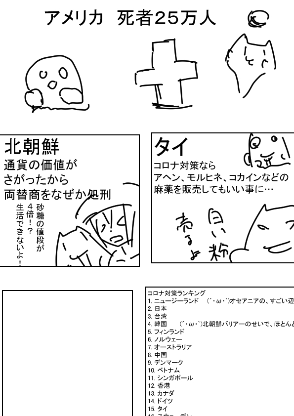 | ●8 件のコメント : 匿名2020年11月28日 18:48 海中なんていう修羅の世界でコロナウィルスが いつまでも生きてられる訳ねぇだろ・・・ 陸上なんかより よっぽど古くから細菌類が生存競争続けてきてんだぞ だいたい海中生物と陸上生物じゃ 免疫系統やなんやら違い過ぎて 相互に感染するように進化するなんて無理すぎる そんなん心配するより手洗いうがいと除菌消毒 不用意な密集を防ぐための集会の禁止と すぐ火病る国民性の改善を進めろよ 返信 返信 (´・ω・`)パルメ2020年11月29日 0:43 (´・ω・`)コロナより、餓死の方が身近じゃろうしな…北朝鮮 (ノ゜ω゜)(ノ゜ω゜)疫病流行前から、食料不足で、中国の村に略奪しにいってるし… 返信 匿名2020年11月28日 20:07 WHO「新型コロナウイルスは当初から世界中にあった。たまたま武漢で見つかっただけ」 返信 返信 匿名2020年11月28日 20:40 コロナウイルスはは当初から世界中にあった と たまたま新型が武漢でみつかっただけ という何の関連もない二つの文章をくっつけて人をだます意図にあふれた詭弁ですね 匿名2020年11月29日 18:45 100%それを信じたところで流行を隠ぺいして各国にばらまいたことが問題なんだよなぁ…… 返信 匿名2020年11月28日 23:37 本来なら国内取引は自国通貨で済むから相場は関係ないよな。 中国との密輸、といいたいけどそれを処刑したって密輸できなくなるだけだし、自国の通貨が通用しないまで体制が力を失ってきているのかな。 返信 匿名2020年11月29日 16:52 処刑を乱発する金と北主導の統一を目指す文とどっちが狂っているのか…先生、SAN値チェックお願いします。 返信 返信 (´・ω・`)パルメ2020年11月29日 17:25 (´・ω・`)この戦い…アザトースが勝つわ… (ノ゜ω゜)(ノ゜ω゜)発狂するな!?● |