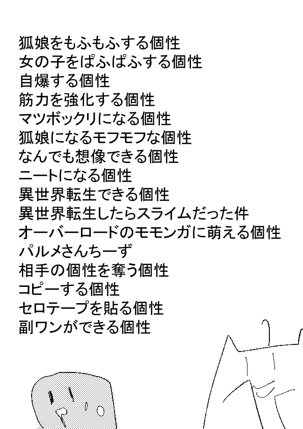 -- ★(ノ゜ω゜)(ノ゜ω゜)先生ぇー!個性を大量に考えるの面倒だぞー! -- †(´・ω・`)ハンターハンターみたいに、能力発揮する前に全員皆殺しにすればワンチャンス…… -- ★(ノ゜ω゜)(ノ゜ω゜)漫画の種類が違うだろおぉぉぉ! -- †(´・ω・`)ぶっちゃけ個性より、キャラの外見や装備を描くのが一番面倒…… -- ★(ノ゜ω゜)(ノ゜ω゜)先生ぇー!もっと漫画を描く速度をあげろー! -- †(´・ω・`) (ˇωˇ)スヤァ… -- ★(ノ゜ω゜)(ノ゜ω゜)先生の個性は……睡眠!? -- |