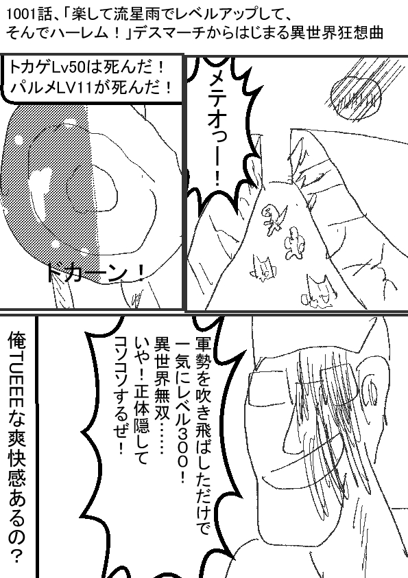 | 【1】デスマーチからはじまる異世界狂想曲 「楽して流星雨でレベルアップして、そんでハーレム!」 |