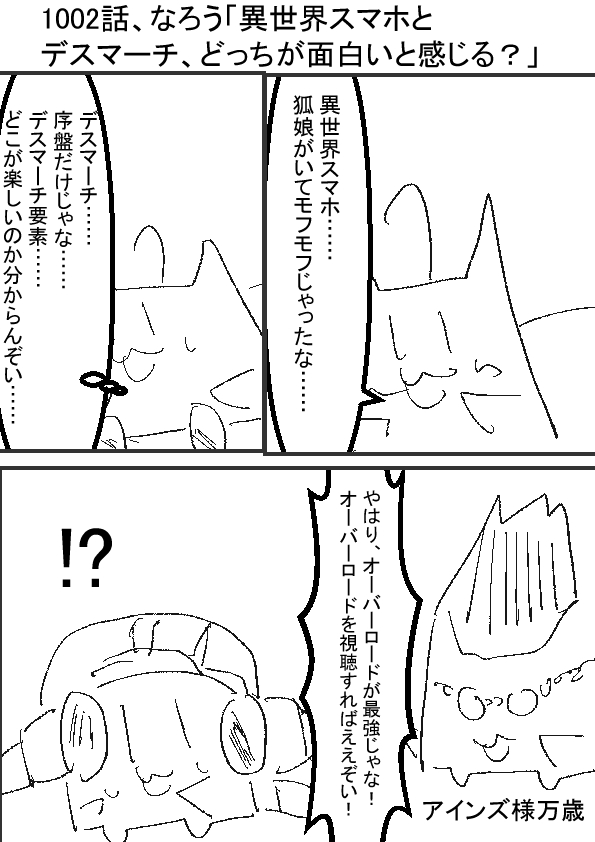 ★(ノ゜ω゜)(ノ゜ω゜)先生は、異世界スマホと、デスマーチ異世界。どっちが面白いと思うの? -- †(´・ω・`)わしは、デスマーチの漫画版を読んで……「最強なのに、なんでこそこそしているの?無双しないの?え?」って思って、つまらんと思った派 -- ★(ノ゜ω゜)(ノ゜ω゜)じゃ、異世界スマホは? -- †(´・ω・`)楽して無双してハーレムして、一応、爽快感……? そうかいかん?があったから、異世界スマホは楽…… いや、狐娘がいたから、異世界スマホは最高じゃな? -- ★(ノ゜ω゜)(ノ゜ω゜)アンタ!?なんで疑問形なんだ!? -- †(´・ω・`)オーバーロードがダントツで最強じゃな -- ★(ノ゜ω゜)(ノ゜ω゜)こら!?他作品を宣伝するな?! -- †(´・ω・`)じゃ幼女戦記が最強…… -- ★(ノ゜ω゜)(ノ゜ω゜)やめろぉー!?なんで異世界スマホと、デスマーチを比較する記事で、他の作品を宣伝しているんだ!?アンタって奴はぁー! -- |
