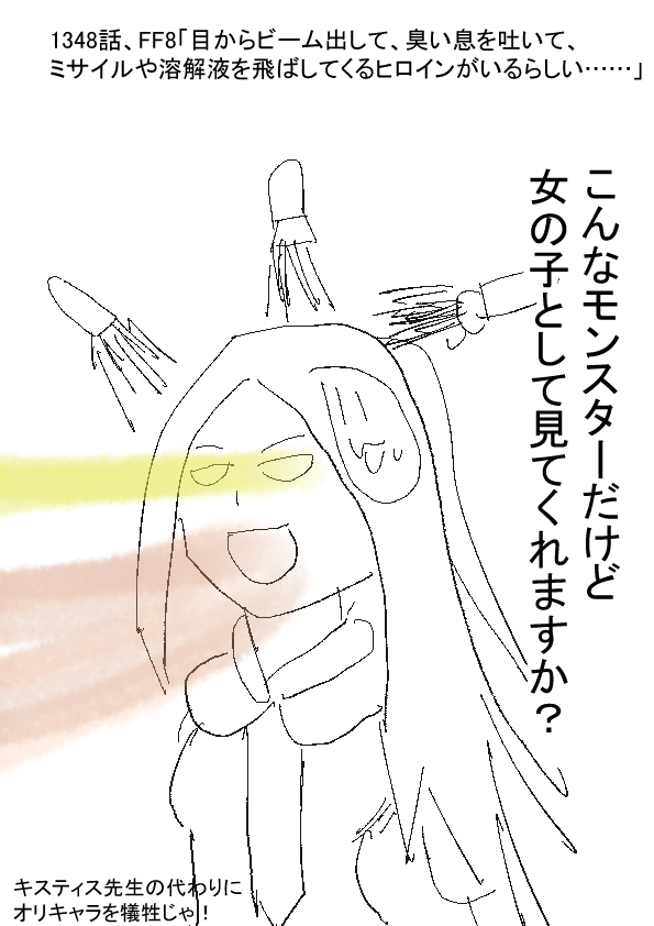 キスティス先生(´;ω;`)青魔法って、敵の技が使えるのよ…… だから、目からビームとか、ミサイルとか、撃てちゃうの…… ↓ (´ω`)青魔法ってダメージがしょぼいだろ? 帰れモルボル女 キスティス先生(´;ω;`そんなぁ…… ★★★ -- ★(ノ゜ω゜)(ノ゜ω゜)こらぁー!?キスティス先生をモンスター扱いするなぁー! -- †(´・ω・`)でも戦闘中に……モンスターの技使いまくる女じゃぞ……? 臭い息とかやばいじゃろ…… きっと、彼女が孤児になったのは、青魔法のせいじゃな…… -- ★(ノ゜ω゜)(ノ゜ω゜)その推理はやめろぉー!? -- †(´・ω・`)(でも一発芸としては良さそうじゃな……「目からビーム!」とか、きっと皆、驚いてくれるぞい……)