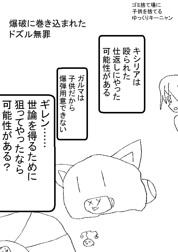 ドズル(´;ω;`)ぎゃー!サスロ兄ごと爆破されたぁー! 犯人は誰だぁー! 犯人( ´ ω ` )生命力ありすぎやろ……隣の席に座っていたのに、命に別状ないとか…… ★★★ ー ★(ノ゜ω゜)(ノ゜ω゜)先生ぇー!誰だぁー!サスロを殺したのはー! ーー (´・ω・`)ギレン? ー ★(ノ゜ω゜)(ノ゜ω゜)え?なんで? ーー (´・ω・`)将来のライバル候補じゃし。サスロを爆殺すれば、同情っていう世論を購入できるぞい? ー ★(ノ゜ω゜)(ノ゜ω゜)ひでぇ!?キシリアが犯人じゃないの!? ーー (´・ω・`)キシリアって、激怒すると、直情的に相手を撃ち殺す感じの娘じゃと思うから…… 爆破テロとかの陰謀は、ギレンなんじゃないかのう……(爆破事件の前に、サスロ兄に殴られたから、冷静じゃないだろうし…… ー ★(ノ゜ω゜)(ノ゜ω゜)ひどい推理だ…… ーー |