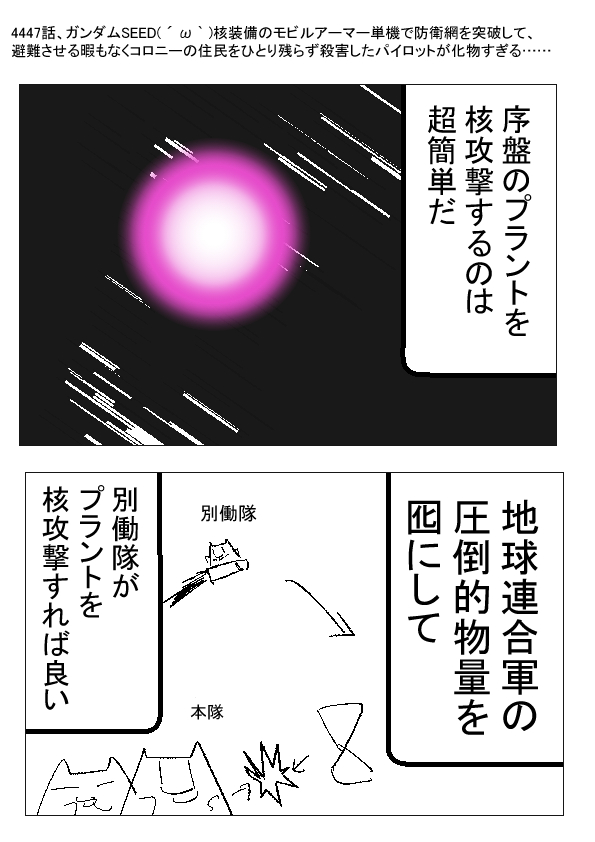 | 【92】ガンダムSEED ( ´ ω ` )核装備のモビルアーマー単機で防衛網を突破して、避難させる暇もなくコロニーの住民をひとり残らず殺害したパイロットが化物すぎる…… |