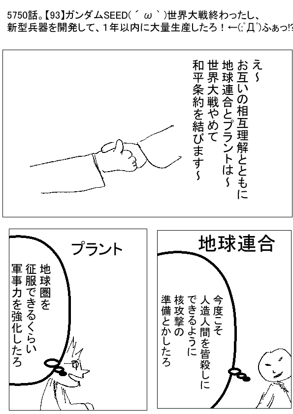 プラント(´・ω・`)ヤキン・ドゥーエでの戦いで、世界大戦終わったな…… (新型兵器を開発して量産したろ。 地球人類皆殺しにできるジェネシスを小型化や) 地球連合(´・_・`)お互いの相互理解を深めようぜ (核兵器を次は、確実に打ち込んで皆殺しにできるようにしたろ。 新型兵器もじゃんじゃん開発するぜ) ★★★ ーー ★(ノ゜ω゜)(ノ゜ω゜)先生ぇー!どういう事だぁー!? ーー †(´・ω・`)でぇじょうぶだ! 現実でも、第二次世界大戦終わった後に、次の争いに備えて、兵器を大量生産したし! ーー ★(ノ゜ω゜)(ノ゜ω゜)予算はどこから出るんだ!? ーー †(´・ω・`)……税金? 兵器って、敵国に売れないからのう…… ーー ★(ノ゜ω゜)(ノ゜ω゜)軍縮条約くらい結べよ!?第一次世界大戦の後みたいにさぁ! |
