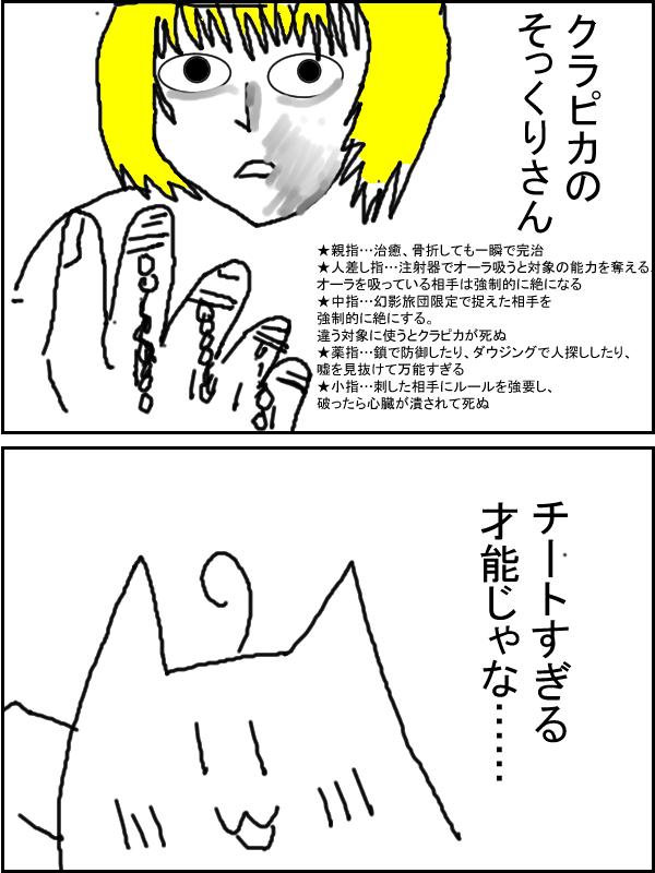 ★(ノ゜ω゜)(ノ゜ω゜)先生ぇー!クラピカが万能すぎるよー! †(´・ω・`)怪我をしても、すぐに全治! ★(ノ゜ω゜)(ノ゜ω゜)戦闘できて最強すぎる!? †(´・ω・`)近接戦闘しても、エンペラータイムで強化系の性能が100%が発揮できるから、ちゅよい! ★(ノ゜ω゜)(ノ゜ω゜)具現化系なのに近接戦闘も得意!? †(´・ω・`)注射針を刺せば、絶状態にしながら、オーラを回復できて、相手の能力も一時的に奪える! ★(ノ゜ω゜)(ノ゜ω゜)チーターだ!? †(´・ω・`)そんで残りの指が15本!特殊能力増やしMEN! ★(ノ゜ω゜)(ノ゜ω゜)こら!?足の指を換算するな! 足に指輪をはめたら、痛くなるぞ! †(´・ω・`)(ぶっちゃけ、指輪がある方の腕を切り落とされたら、能力全部消失するんじゃろうなぁ……) 【HUNTER×HUNTER】 ☚まとめたページ ●記事を日付順にブログで表示する( ;∀;)? | ||||