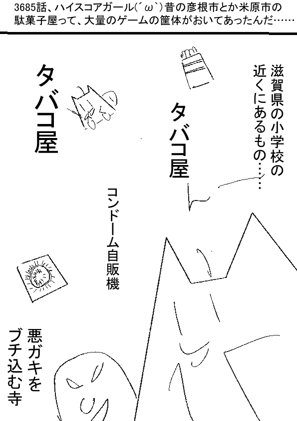 主人公達(´;ω;`)あー、新幹線に乗り遅れて、滋賀県の米原市に取り残された〜。 歩いて京都に向かうぞー。 お!駄菓子屋の目の前に、大量のゲームの筐体があるやんけ! ゲームしたろ! ★★★ - ★(ノ゜ω゜)(ノ゜ω゜)先生ぇー!駄菓子屋の前に、大量のゲームの筐体があったらしいぞー! -- †(´・ω・`)……うむ、最強じゃな? - ★(ノ゜ω゜)(ノ゜ω゜)見たことある? -- †(´・ω・`)うーん……川沿いの駄菓子屋じゃったからのう…… きっと、近くに学校があって、そこから子供たちが大量に殺到する立地だったんじゃろうて…… - ★(ノ゜ω゜)(ノ゜ω゜)彦根市にそんな駄菓子屋ありそう? -- †(´・ω・`)学校の前にタバコ屋さんがある地域は、たくさんあるけど……ゲームを大量に設置した駄菓子屋は見たことない気がする…… でも、昔のデパートは、ゲーム機を大量に設置してたし、可能性的にはありえるかのう…… - ★(ノ゜ω゜)(ノ゜ω゜)こら!?こっそり滋賀県の暗部を語るのはやめろ!? -- †(´・ω・`)小学校の前に、タバコ屋さんがある地域とか、あるぞい(今は廃業してるけど - ★(ノ゜ω゜)(ノ゜ω゜)!? -- |
