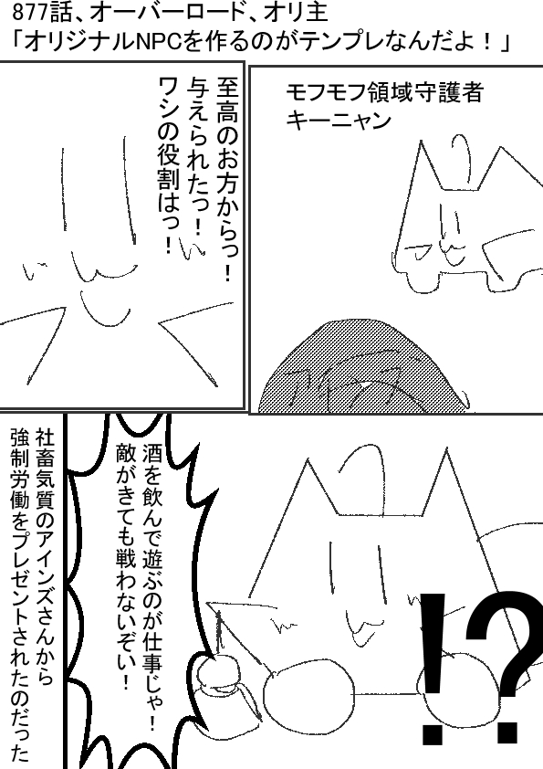 【オーバーロード】←まとめたページ ーー ●(ノ゜ω゜)(ノ゜ω゜)先生。オバロ二次創作で、どんなNPCがいました? ーー ★(´・ω・`)大抵、六階層の自然豊かな場所に、研究所とか、基地とか、拠点を構えて集団で生活しているぞい ーー ●(ノ゜ω゜)(ノ゜ω゜)(他の階層、ひどすぎる環境だもんなぁ……) ーー ★(´・ω・`)隠しステージをダンジョン内に作って、そこに要らないアイテムや、要らないオリジナルNPCを配置する作品とかも、複数見たぞい。忘却領域とか、廃墟とか、そんな名称がつけられておった。 ーー ●(ノ゜ω゜)(ノ゜ω゜)NPCの扱いが酷すぎるだろ!? ーー ★(´・ω・`)他にも9階層に守護者おいたり、工房の領域守護者とか作っている作品もあったぞい ーー ●(ノ゜ω゜)(ノ゜ω゜)セバスたちの仕事が激減しちゃうよ!? ーー ★(´・ω・`)不思議と、第五階層と、第七階層に、オリジナル拠点やNPCを置く作品が少ないのう ーー ●(ノ゜ω゜)(ノ゜ω゜)当たり前だろ!?氷河とか、溶岩エリアとか、耐性なかったら死ぬでしょ?! ーー ★(´・ω・`) (第六階層に、LV1のきつね娘が大量に住む村とかを作りたいぞい……)