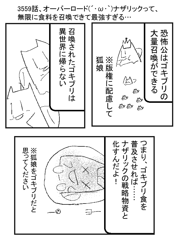 アインズ「ふっ……すごいことを思いついたぞ。 恐怖公が召喚するゴキブリはWEB版だと、異世界に帰還しない……つまり、虫食を普及させれば、全世界がナザリックのゴキブリに依存するようになる……」 でみえもん「さすがだ……ノーコストで、全世界を征服……」 ★★★ ー ★(ノ゜ω゜)(ノ゜ω゜)先生ぇー!この方法には致命的な大問題がある! ーー †(m´・ω・`)ん? ー ★(ノ゜ω゜)(ノ゜ω゜)ゴキブリ嫌いのNPC多そうな感じだろ! ーー †(m´・ω・`)!? ー ★(ノ゜ω゜)(ノ゜ω゜)全世界でゴキブリ食を流行させたら、アルベドのストレスがマッハだぞ! ーー †(m´・ω・`)タイトルをオーバーゴキブリに変えちゃえ ー ★(ノ゜ω゜)(ノ゜ω゜)こらー!? ーー †(m´・ω・`)