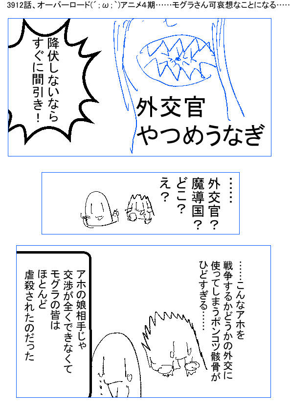 ー ★(ノ゜ω゜)(ノ゜ω゜)先生、あなたはクアゴアというモグラ亜人だ ーー †(m´・ω・`)? ー ★(ノ゜ω゜)(ノ゜ω゜)魔導国からやってきた外交官は、偽乳のシャルティア……どうする? ーー †(m´・ω・`)出会ってすぐに、全部族まとめて降伏しないと、間引きされる……? ー ★(ノ゜ω゜)(ノ゜ω゜)はい、アホな子だから、何も考えてません ーー †(m´・ω・`)(アニメ4期……可哀想なモグラさん達が登場して、涙目じゃのう……)