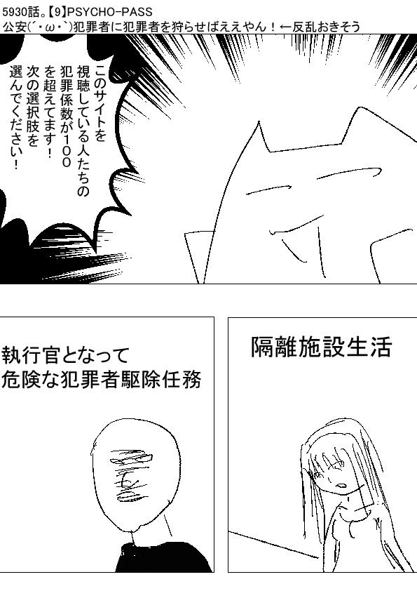 国(´・ω・`)犯罪係数高いやつは、隔離施設行きやで! でも、執行官になれば、監禁生活やけど私室で好きなように暮らせるで! 執行官(´;ω;`)何も犯罪してないのに、犯罪者扱い…… しかも、任されるの危険な仕事やんけ…… ★★ - ★(ノ゜ω゜)(ノ゜ω゜)先生ぇー!あなたは執行官だ! -- †(´・ω・`)いやじゃ!わしは自由に外で、きつねっこをモフモフするんじゃ! - ★(ノ゜ω゜)(ノ゜ω゜)こら!?そんな思考だから、犯罪係数が高いんですよ! -- †(´・ω・`)?モフモフするの犯罪? - ★(ノ゜ω゜)(ノ゜ω゜)モフハラです -- †(´・ω・`)……シビュラシステムをぶっ壊そう…… - ★(ノ゜ω゜)(ノ゜ω゜)こら!?社会システムの代替え案ないのに、壊すな!? -- |