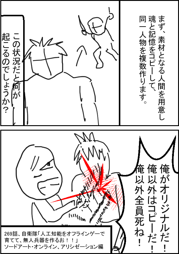 ★(ノ゜ω゜)(ノ゜ω゜)先生ぇー!つまり、どういう事だ!? †(´・ω・`)ほら、人工知能搭載の無人兵器とか、低コストで最強じゃろ? 破壊されても、莫大な補償をしなくてもいいし、世論を刺激しないしのう。しかも、人間を搭載しないおかげで、機体性能を極限まで高める事ができるぞい。 だから、日本が人工知能を開発しようと頑張っておるんじゃよ ★(ノ゜ω゜)(ノ゜ω゜)へぇー †(´・ω・`)……でも、SAO世界では、ボトムアップ型の人工知能をコピーして、複数生産すると……お互いがお互いを憎しみあって、全存在をかけて「自分がオリジナル」だと証明するために殺しあうっぽいから、 「この計画は最初から失敗していたんだよ!」 って、最後辺りにキリトさんが言いそうだなと思った。日本人的にも、そっちの方が受け入れやすい結末じゃろうし ★(ノ゜ω゜)(ノ゜ω゜)早くアリシゼーション編、最後まで読めよ!? あと、先生も、毎回、地面から生えてきますよね! たくさん、自分のコピーがいるんじゃないですか!ほら!生存をかけて殺しあえ! †(´・ω・`)……わしが、たくさんいる……? 身体が複数あるとか、最高すぎるじゃろ…… 情報を共有するネットワークが欲しいのう…… ★(ノ゜ω゜)(ノ゜ω゜)喜ぶな!? 【SAO】 ☚全てまとめたぺーじ | |