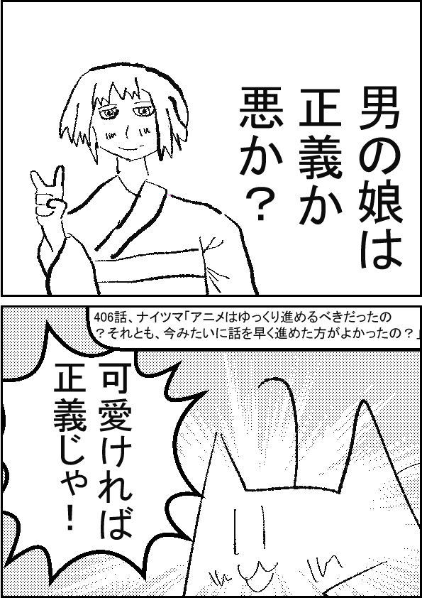 >(´;ω;`)アニメにすると、微妙なお話回になりそうじゃから、あえて削ったんじゃと思う。アニメはアクションシーンが映えるお。