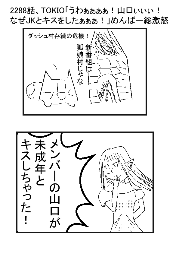 城島茂「これまで山口達也という人間を信頼してくださったファンの皆さま、共演者の皆さま、そして関係者の皆さま、本当に申し訳ございません。グループをまとめるリーダーとして、男として情けない限りです。同じメンバーとして山口達也には今回のことを誠心誠意償うことを望みます」 メンバーたち「許さねぇぞー!山口ぃっー! 女子高生とキスしたお前のせいで、俺らの今までの努力がパァーだろー!」 ★★★ -- ★(ノ゜ω゜)(ノ゜ω゜)先生ぇー!ダッシュ村はどうなるんだぁー! -- †(´・ω・`)ん?存続するんじゃないの? -- ★(ノ゜ω゜)(ノ゜ω゜)メンバー全員交代ENDになったら、どうなるんだ!? -- †(´・ω・`)出番が回ってきた俳優たちが喜ぶ? -- ★(ノ゜ω゜)(ノ゜ω゜)そういう問題なの? -- †(´・ω・`)商品として傷ついたから、新品(新しい糸人)と交換する可能性があるしのう… -- ★(ノ゜ω゜)(ノ゜ω゜)モノ扱いはやめろー!? -- |