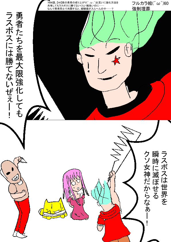 チートオリ主(・ω・`)原作知識があるから知ってるぜ! 勇者の武器は、それぞれの強化方法を共有できるから、めっちゃ強くなるんだぜ! 勇者たち「「まじで!?チートじゃん!」」 チートオリ主(・ω・`)でも、全員で共有しても、ラスボス相手だと瞬殺されるぜ! 勇者たち「「駄目じゃん!」」 チートオリ主(・ω・`)異世界の外にいる神殺しを、偶然、見つけないと勝てないんだ! 勇者たち「「駄目じゃん!」」 ★★ -- ★(ノ゜ω゜)(ノ゜ω゜)先生ぇー!なんで共闘できないんだぁー! −− ●(´・ω・`)……確か武器同士が反発して、経験値が手に入らない仕様だっけ……?(近くにいると -- ★(ノ゜ω゜)(ノ゜ω゜)はい −− ●(´・ω・`)(なんで反発するんじゃっけ……?わからんのう……) -- ★(ノ゜ω゜)(ノ゜ω゜)お互いに仲よくなって、強化方法を共有しないといけないのに、別々行動をする事を強いられてますよ!? −− |