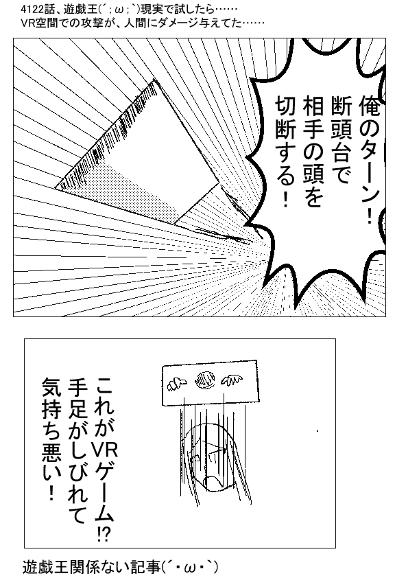 本日、断頭台のワールドにて合意の上で斬首されてきました。その結果、しばらく動くこともできないほどの精神的な衝撃を受けました。全身から冷や汗が吹き出して、手足が痺れ、力は入らず、意識は遠のき、首に違和感が現れました。VRに魂が引っ張られている人たちは注意です。 https://www.moguravr.com/vr-guillotine/amp/ ★★★ - ★(ノ゜ω゜)(ノ゜ω゜)先生ぇー!どういうことだー!? -- †(´・ω・`)闇のゲームじゃ! - ★(ノ゜ω゜)(ノ゜ω゜)遊戯王知らない奴にも、わかるように説明しろ!? -- †(´・ω・`)ゲームに負けたものはっ!代償を支払う! - ★(ノ゜ω゜)(ノ゜ω゜)単純に、暗示にかかりやすい人が、仮想空間での事に、ひどい衝撃を受けただけだろ!? -- †(´・ω・`)(最近のVRゲームはすごいのう……断頭台での首切り体験とか……どんな需要があるんじゃ……?) |