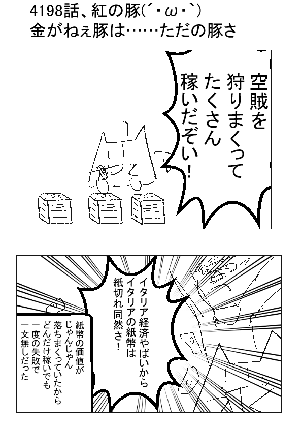 イタリア(´;ω;`)世界恐慌で、紙幣が紙くず……イタリア人(´;ω;`)仕事ないから、アメリカに出稼ぎにいってくる マルコ(´;ω;`)いままで、たくさん稼いだけど……飛行艇の修理費で全部消えた……★★★-- ▼(ノ゜ω゜)(ノ゜ω゜)先生ぇー!やめろー!--†(´・ω・`)稼いだ金が、どんどん価値がなくなっていく…… 人生はクソゲーじゃのう--▼(ノ゜ω゜)(ノ゜ω゜)というか、皆、出稼ぎにいくとか……やばくない?-- †(´・ω・`)確か、当時のアメリカが、世界恐慌になったのに、金の流れを止めちゃって、余計に世界経済が悪化した時代じゃったのう……-- ▼(ノ゜ω゜)(ノ゜ω゜)というか、賞金稼ぎとか、空賊って稼げるの……?--†(´・ω・`)(飛空艇そのものが高価じゃしなぁ…… 海賊の方が、燃費いいし、ワンチャンス……)
