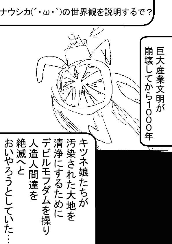 ★★★--▼(ノ゜ω゜)(ノ゜ω゜)先生ぇー!ちゃんと説明しろー!--†(´・ω・`)眠い-- ▼(ノ゜ω゜)(ノ゜ω゜)これじゃ、狐娘の谷のキーニャンだよ!?ジブリ関係ないよ!?-- †(´・ω・`)……地球を浄化するために、狐娘たちが頑張っている作品です--▼(ノ゜ω゜)(ノ゜ω゜)平然と嘘をいったな!?-- †(´・ω・`)ナウシカ達は、汚染された世界じゃないと生きていけない。浄化された世界では、空気吸っただけで即死である。-- ▼(ノ゜ω゜)(ノ゜ω゜)今度は本当の事をいった?!-- †(´・ω・`)人造人間や、汚染された環境を前提にした植物たちが生き残るには、腐海を一つ残らず焼き払うしかない……-- ▼(ノ゜ω゜)(ノ゜ω゜)(胞子ひとつ飛んでくるだけで、人間社会終了なのに……?)--