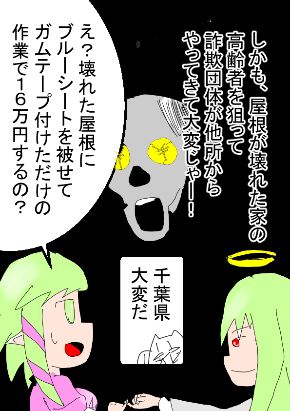 | ● 18 件のコメント : (´・ω・`)パルメ2019年9月18日 17:45 (´・ω・`)人間は、地上をあきらめ、地下へともぐった…… (ノ゜ω゜)(ノ゜ω゜)諦めちゃ駄目だろ!? 返信 返信 匿名2019年9月18日 20:35 そして宇宙戦艦ヤマトに続く 返信 匿名2019年9月18日 18:51 本州って瓦の屋根の家屋が多いよね(道民的視点)。 ちょっとググって見たけど、昔の建築基準法がユルかった頃の土葺き方式で固定されてない瓦の屋根は、 今の九州や大阪神戸ではありえないんだろうけど、千葉にはまだ多く残っていたのかな。 もし建築基準法・ガイドラインに適合する瓦屋根に交換して耐えられるなら、 パルメさんのようにあきらめる段階にはまだ早いかも。 返信 返信 (´・ω・`)パルメ2019年9月18日 20:19 (´・ω・`)確かに、瓦の屋根が多い印象受けたのう (ノ゜ω゜)(ノ゜ω゜)それが飛んで、窓ガラスぶっ壊したニュースとかやってた記憶がある…… 匿名2019年9月18日 21:58 本物の瓦じゃなくて軽量屋根材ってやつじゃないかな? 瓦に似せた金属だったり樹脂でできたもの 匿名2019年9月19日 5:08 南総はもともと風の強い所だから、重い本物だよ 落ちてくだけたのを、移動の邪魔だからさっさと片しただけで 返信 匿名2019年9月18日 19:43 (#゜Д゜)屋根修理の出来る職人なんぞ、いくらでも在るが、千葉土建を始めとした地元のうんこどもが邪魔 東京や神奈川の現場には、呼べれもせんのにダンピングで相場を荒らしておきながら、地元には来るなとか 返信 返信 (´・ω・`)パルメ2019年9月18日 20:25 (´・ω・`)被災地まできて、仕事してもらうとなると、けっこう金かかりそうじゃのう 匿名2019年9月19日 10:31 >屋根修理の出来る職人なんぞ、いくらでも在るが んなわけないじゃん 大阪ですらまだ全然職人が足りなくて修理が始まってもいない家がたくさんあるんだぞ 一時期殺しにかかった影響で土建屋と大工は壊滅状態だよ (´・ω・`)パルメ2019年9月19日 14:55 (´・ω・`)被災した伊豆諸島とか、家屋400棟が壊れて、専業大工が25人しかいなくて、大変らしいのう…… 匿名2019年9月19日 16:35 屋根修理なんて、壊れたのを含めて全部取っ払って、垂木ながして、野地板張って、防水シート張って、アスファルトシート張って、瓦ざん敷いて、瓦載せれば終りだよ、瓦が重ければ、スレートでも構わないし安い 材料と工具は、全部ホームセンターで手に入るし、素人の日曜大工でも出来る やり方はユーツベで動画があるよ 匿名2019年9月19日 20:44 それじゃあ業者は大儲けだな なり手が殺到するだろうな凄いねー 返信 匿名2019年9月18日 20:03 >16万 いや、高所作業の危険手当と千葉までの出張費考えたら、16万普通だと思いますよ。 人件費に高所作業手当と保険含めて1人3万で4人で12万。あと、資材費と交通費なら普通に16万普通にいく。 まぁ、どの程度の作業かによって変わるので、実際の作業と値段を確認できないと、あってるかわからないけど。 ただ、けっこう多くの人が人件費や作業費を甘く見すぎ。 作業は、数時間で済んでも遠方から来てもらうだけで、その人の一日潰れてるから、一日分の日当かかるていうのにねぇ。 返信 返信 (´・ω・`)パルメ2019年9月18日 20:23 (´・ω・`)依頼人が、屋根の上を確認しないから、ブルーシート被せて、ガムテーブ張っただけでおしまいんじゃよ (ノ゜ω゜)(ノ゜ω゜)雨が降ったら、いずれ粘着力消えて、ブルーシート飛んでいきそう…… 匿名2019年9月18日 22:53 画像を見ると、緑色の養生テープが足りなくなったから残りは茶色のガムテープで済ませた適当感があって草。 シートが飛ばないよう置く重しとかヒモ結びでの固定は別料金って言われそう。 匿名2019年9月19日 0:57 聞いた話だけどブルーシート被せるにもある程度の耐久性持たせるにはやっぱり技術が要るらしいぞ 素人がやるとちょっとした風ですぐ飛んだりめくれたりってことでたかがシート被せるだけとはいえプロに任せないとダメみたい 匿名2019年9月19日 3:34 玉掛けみたいなかんじかね 返信 匿名2019年9月18日 22:04 なんか信号機用の発電機が盗まれてるらしい ● |