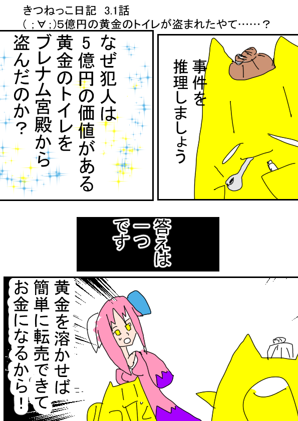| きつねっこ日記 3.1話 ( ;∀;)5億円の黄金のトイレが盗まれたやて……? (´・ω・`) 話数はタイトルに後ろにつけてUP |