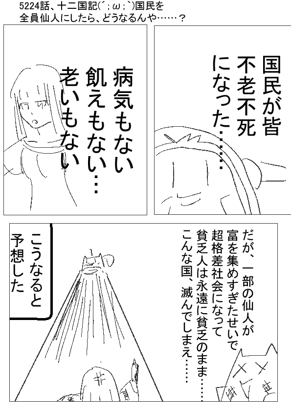 国(´・ω・`)なんと!簡単に仙人になれます! 仙人なると、頑強な肉体となり、半永久的な寿命をゲット! 飢える事も、病気になる事もない! 怪我をしても、すぐ治る! 農民( ;∀;)わぁー!仙人になったおかげで、体の性能があがって、農作業が楽になったー! 国(´・ω・`)どうや! ★★★ - ★(ノ゜ω゜)(ノ゜ω゜)先生ぇー!どうなると思うー! -- †(´・ω・`)……食わなくても飢えないから、人口1000万人とか、一億とかもOKになる? - ★(ノ゜ω゜)(ノ゜ω゜)いや、もっと推理しろ! -- †(´・ω・`)精神が持たなくなって、100年過ぎたころには、仙人やめる奴らが続出する! 長生きし過ぎて疲れる! - ★(ノ゜ω゜)(ノ゜ω゜) -- †(´・ω・`)世代交代がうまくいかなくなって、富が一部の層に偏る! 田畑を独占する仙人がでてくる! - ★(ノ゜ω゜)(ノ゜ω゜)(仙人だらけの国にしたら、破綻しそう……?) -- |