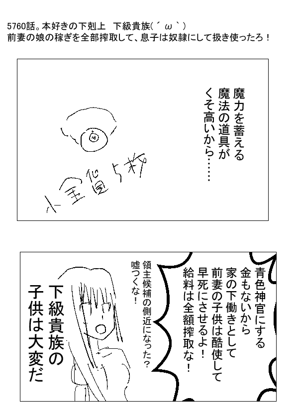 新しい妻(´・ω・`)新しい母親やで! お前、主人公の側近になったとか、嘘ついたな! 稼ぎは全額没収するで! 前妻の子供たち「「そんなぁぁぁぁ! 主人公から、魔力を上げるチートを教えてもらえる教育料なのにぃぃ!」」 新しい妻(´・ω・`)魔力を蓄えるアイテムを取り上げるわ! 私が生んだ子供のために使うよ! 前妻の子供たち「「うわぁぁぁぁ!そのアイテムないと、貴族院での授業不可能になるから、もう、弟の方は貴族になれないぃぃぃ! それどころか、魔力を蓄えすぎて死んじゃう!?」」 新しい妻(´・ω・`)死ぬまでの間、下働きとして酷使するで! 地雷「領主の養女に喧嘩売ったも同然! 弟の方は、孤児院にいれるよ!」 ★★★ -- ★(ノ゜ω゜)(ノ゜ω゜)先生ぇー!なんで、この話を取り上げた?! -- ●( ´ ω ` )良い感じに愚民じゃったもん…… -- ★(ノ゜ω゜)(ノ゜ω゜)愚民? -- ●( ´ ω ` )領主の養女に喧嘩うったも同然だから、この家族の人生終了じゃな? -- ★(ノ゜ω゜)(ノ゜ω゜)!? -- |