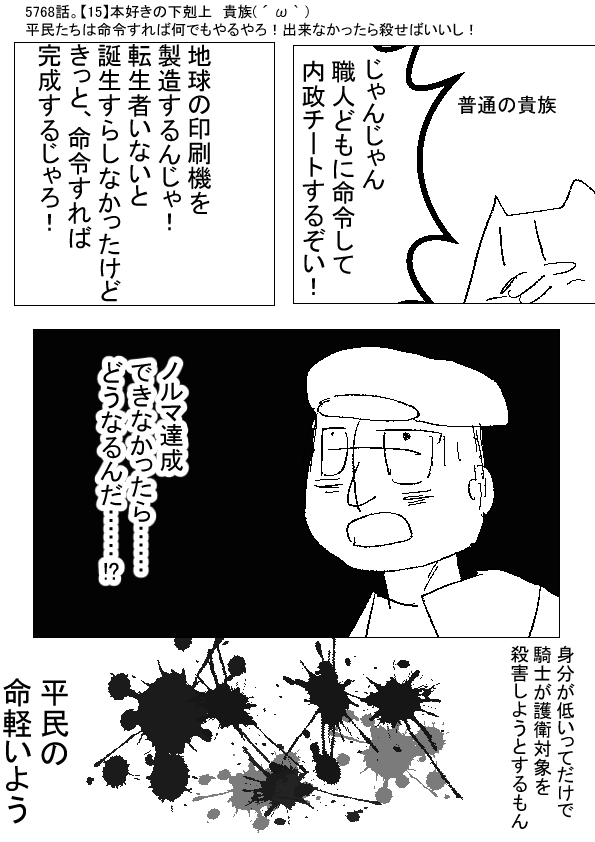 平民(´;ω;`)貴族に文句言うと、町ごと皆殺しになる世界観だから、反論すら許されない…… 貴族「おら!俺らの言う通りに、技術チートが必要な代物を大量生産しろや! 主人公の内政チートの手伝いを、俺らがするで!」 平民(´;ω;`)ひ、ひぃ!こ、殺される! 貴族の言うこと実行できないやつは、物語序盤ですら、始末されてたし! 主人公(´;ω;`)普通の貴族に任せたら、私が育てた職人たちが全滅しちゃうでしょぉぉ!? 私の事業だから、文官は私が選ぶよ! 女装趣味のエクストスなんとか、どう!(キャラ多すぎてうろ覚え 下町に入って、情報収集する変態だから適任だよね! ★★★ -- ★(ノ゜ω゜)(ノ゜ω゜)あの……さすがに領主主導の産業だから……貴族たちも慎重になるんじゃ……? -- ●( ´ ω ` )それはどうじゃろう? -- ★(ノ゜ω゜)(ノ゜ω゜)? -- ●( ´ ω ` )他の工房にもできるやろ!って、貴族が勘違いして、職人を使い潰して殺したら……印刷とかは終了じゃろ…… -- ★(ノ゜ω゜)(ノ゜ω゜)(手先が超器用な技術チート人材が必要だもんなぁ……お前はドワーフか!っていうレベルの……) -- ●( ´ ω ` )領主の町のチート職人を使い潰したら、人材不足の領地じゃし、代わりの職人を育成するまで、印刷機の生産と運用に大打撃を被るじゃろうしなぁ…… |