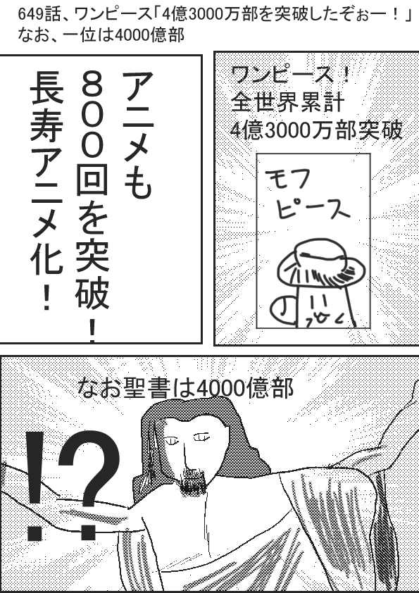 ★(ノ゜ω゜)(ノ゜ω゜)先生ぇー!? 一位の聖書は、なんで4000億部も発行しているんだ!? 地球の総人口はたったの70億だぞ!? †(´・ω・`)布教して信者を増やそうとするから、聖典を大量に印刷して無料配布しておるんじゃよ ★(ノ゜ω゜)(ノ゜ω゜)無料配布か!? †(´・ω・`)うむ……ワンピースは有料じゃからな…… さすがに無料でくばっている代物には勝てないぞい…… ★(ノ゜ω゜)(ノ゜ω゜)でも、先生 †(´・ω・`)なんじゃ? ★(ノ゜ω゜)(ノ゜ω゜)ワンピースも海賊版とかあったり、違法アップロードしているし。 それを含めれば……聖書に勝てるのでは? †(´・ω・`)ふぁっ!?