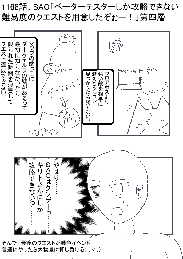 を得るために必要なクエスト! めちゃくちゃ難易度あげたぞ!」 キリト(´;ω;`)ちょおま!? フロアボスより強い化け物相手がいる洞窟で、潜入ミッションかよ!? 見つかったら、一番強い俺らでも全滅するぞ!? ヒースクリフ「しかも、5日以内に、連続クエストとか、戦争イベントを全部達成しないとダメなんだ! 僅かなヒントで、正解を導き出さないとダメだぞ!」 キリト(´;ω;`)ひ、ひでぇ……ベーターテスターな、俺でも辛うじて間に合うレベルの糞クエストじゃないか……! マップの一番端っこにあるダークエルフの城に、真っ先に向かわないとクリアーできないぞ……これ…… キリトさんが気づかなかったら、攻略組全滅していたかもしれない。 フロア水没して脱出できないし。 ★★★ ★(ノ゜ω゜)(ノ゜ω゜)先生ぇー!難易度が高すぎるよー! 圧倒的な速さで、クエストをやっちゃうキリトさんが居なかったら、第四層でも攻略組が壊滅していたかもしれないぞぉー! ーー †(´・ω・`)ふふふふっ……難易度をあげまくるために、作者は存在するんじゃよ? ーー ★(ノ゜ω゜)(ノ゜ω゜)(えと……こんな感じの流れだっけ……?) 5日以内に全クエスト達成しないと、失敗 ⇒ マップの端っこに、ダークエルフの城があるって知らないと時間を浪費して無理ゲー ⇒城についてから、色んなクエストを迅速に終了しないとダメ ⇒戦争イベントに勝たないといけない。敵は物量も質も上。(次の記事で描く) ーー †(´・ω・`)キリトさんのためにデスゲームは存在するんじゃよ……。 キリトさんいなかったら、第二階層で壊滅。 第三階層で、殺人ギルドが煽って、プレイヤー同士で殺し合い。 辛うじて第四層にいけても、フロア水没して全滅…… 最強の布陣じゃな…… |