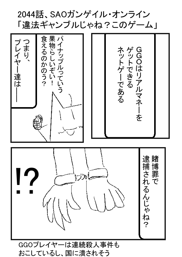 ★★ ーー ★(ノ゜ω゜)(ノ゜ω゜)先生ぇー!リアルマネーを得られるゲームだから……違法ギャンブル扱いされませんか? ーー †(´・ω・`)え? ーー ★(ノ゜ω゜)(ノ゜ω゜)他のプレイヤー殺しまくる事を推奨して、リアルマネーを入手できる時点で……裏カジノと変わらない存在な気がします。 ーー †(´・ω・`)そんな!? ーー ★(ノ゜ω゜)(ノ゜ω゜)だから、このゲームをしているシノンやキリトは、摘発されるんじゃ…… ーー †(´・ω・`)や、やめるんじゃー!? 現実の汚い話はやめるんじゃー!狐娘の話をするんじゃよー! |