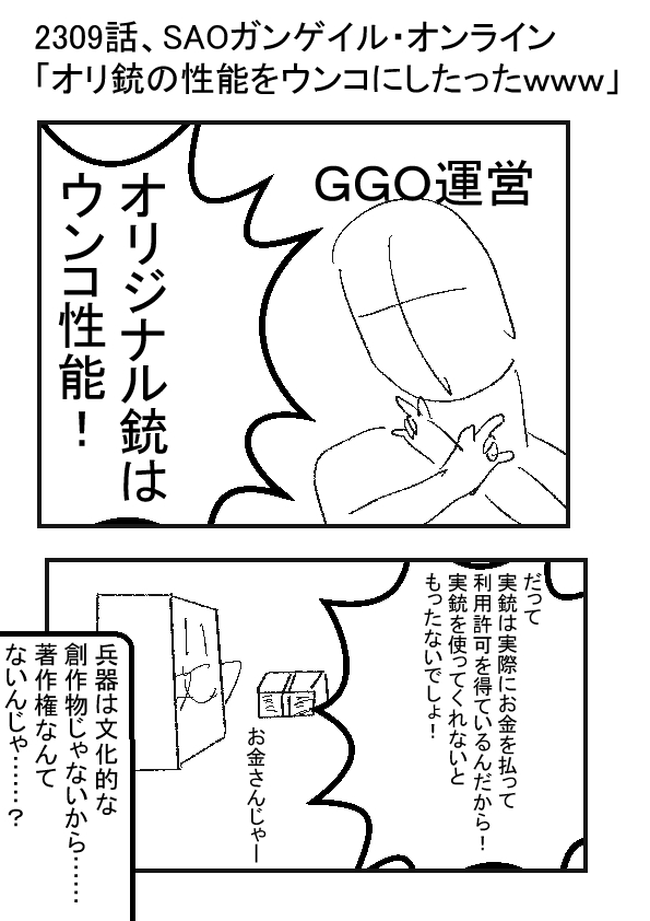 ーー ★(ノ゜ω゜)(ノ゜ω゜)先生ぇー!オリ銃の性能が低いのは、こういう理由でいいのかぁー?! ーー †(´・ω・`)だって……プレイヤーが独自に凄い銃とか作ると……課金アイテムで、すごい銃を販売しても、売れなくなるじゃろ…… ーー ★(ノ゜ω゜)(ノ゜ω゜) ーー †(´・ω・`)プレイヤーが最強武器作れるのは、架空のゲームだけでええんじゃよ…… ーー ★(ノ゜ω゜)(ノ゜ω゜)いや、GGOって架空のゲーム…… ーー †(´・ω・`)しらんがな ーー ★(ノ゜ω゜)(ノ゜ω゜)もうやだ……この先生…… ーー |