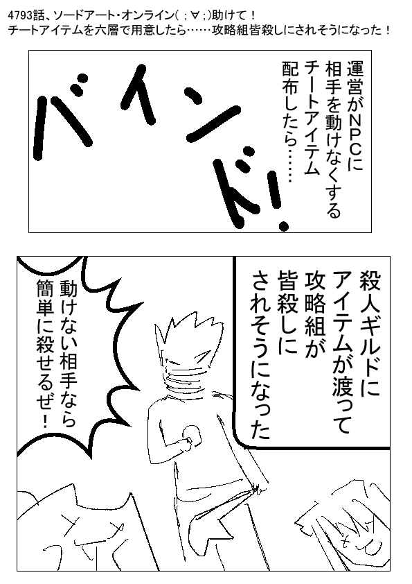 ヒースクリフ( ;∀;)プレイヤー同士での殺し合いを煽ったり 詐欺を教えて、大勢のプレイヤーの武器をだまし取ったり 戦争イベント中に、毒投げこんだり 動けなくなるデバフ効果つきのチートアイテム用意したら 攻略組全員を動けなくして、皆殺しにしようとして大変だった…… ★★ ーー ★(ノ゜ω゜)(ノ゜ω゜)先生ぇー!アイテム一つで、攻略組を皆殺しにできる時点で、クソゲーだぞー!このゲーム! ーー †(´・ω・`)……攻略組が全滅した後に、バランス調整すればワンチャンス……? ーー ★(ノ゜ω゜)(ノ゜ω゜)こら!?デスゲームだと無理だろ!? 攻略組壊滅した時点で、第六層でゲーム終わりだよ!?(人間だと100%攻略できないナンプレの問題がある ーー †(´・ω・`)でぇじょうぶだ!キリトさんの主人公補正で、いつも解決しているべ! ーー ★(ノ゜ω゜)(ノ゜ω゜)キリトさん前提!? ーー †(´・ω・`)キリトさんが活躍してモテモテになる物語だもの…… ーー ★(ノ゜ω゜)(ノ゜ω゜)先生もSAOにログインするんだ! ーー †(´・ω・`)(一度死んだら終わりってのが辛いのう…… 難易度ルナティックなのに……) |