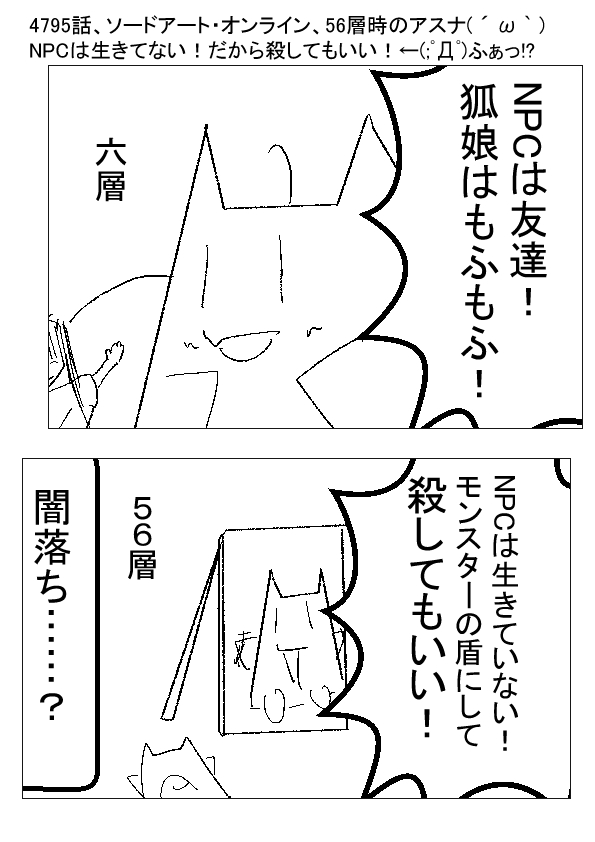 序盤のアスナ( ´ ω ` )へ〜。一部のNPCって、ほとんど人間と変わらないんだ……。 六層のアスナ( ´ ω ` )NPC達と一緒に風呂〜。仲良く会話して友達★! ↓ 56層のアスナ( ´ ω ` )街中にフィールドボスをひきずりこんで、NPCを犠牲にすれば楽して勝てる! NPCは生きてないし! ★★ ーー ★(ノ゜ω゜)(ノ゜ω゜)先生ぇー!アスナが闇落ちしているぞー!? ーー †(´・ω・`)……ぶっちゃけ、過去の設定を気にしながら描けないじゃろ…… 圏内事件は、普通に街中でNPCが襲撃してくる時点で、プレイヤーの殺害方法なんて、色々ある訳じゃし…… 超強いNPCが、プレイヤーを人質にして交渉してくるのは当たり前…… ーー ★(ノ゜ω゜)(ノ゜ω゜)第六層の時点で、75階層の難易度を軽く超えてるもんね……(アスナが頭脳チートで切り抜けた…… ーー †(´・ω・`)設定とは、忘れ去るもの…… それが創作の基本じゃよ? ーー ★(ノ゜ω゜)(ノ゜ω゜)そうなのか……? ーー †(´・ω・`)死んだ人物を、うっかり忘れてだしても問題ない…… ーー ★(ノ゜ω゜)(ノ゜ω゜)週間連載漫画家ネタはやめるんだ!? ーー |