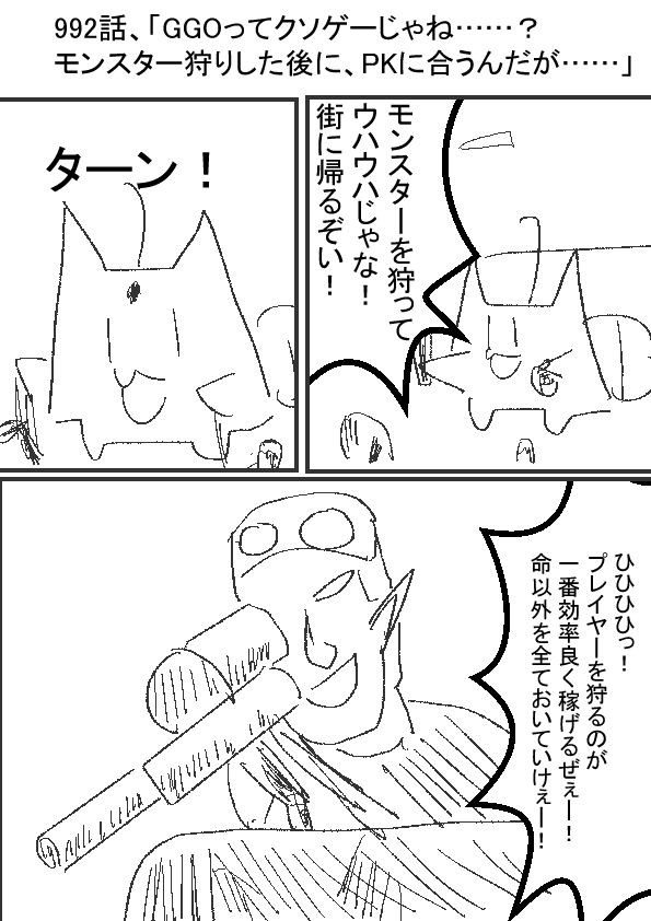 GGOも実際金稼げるからマジでやってる人もいるんだろうけど、稼ぎ過ぎて名前売れると、レア武器目当てのPKにも付け狙われるというデメリットが・・・