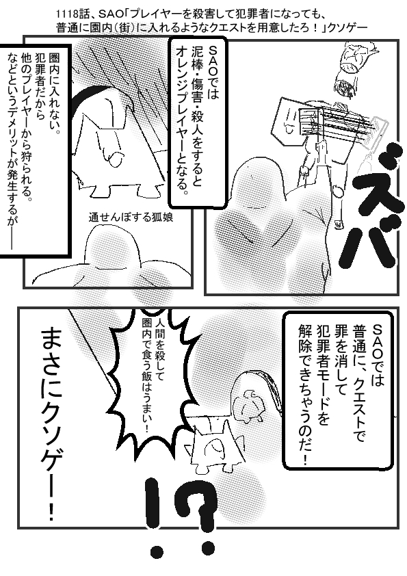 ーー ヒースクリフ「泥棒、傷害、殺人を行ったプレイヤー! このクエストを受ければ、罪が精算されてグリーンプレイヤーに戻れるぞー!」 プレイヤー( ´ ω ` )ひ、ひでぇ…… ヒースクリフ「殺人を楽しむ連中が、色んな階層に移動しまくってSAOの攻略難易度アップ!」 プレイヤー(´;ω;`)難易度ばっかりあげてどうする…… ★★★ ★(ノ゜ω゜)(ノ゜ω゜)あの、先生……プレイヤーが犯罪行為をすると、どんなデメリットが発生するの? ーー †(´・ω・`)殺し合いがない安全地帯(圏内)に入れなくなる。 各階層に移動する転移門は、圏内にあるから、 オレンジプレイヤー(犯罪者)は、クソ遠い所にある迷宮区まで行って、長い冒険して、階層移動しないといけない感じ。 ーー ★(ノ゜ω゜)(ノ゜ω゜)(交通の便が不便になるのか……) ーー †(´・ω・`)あと、オレンジプレイヤーを殺害するのは犯罪行為じゃないから、他のプレイヤーと遭遇したら狩られる? ーー ★(ノ゜ω゜)(ノ゜ω゜)(ラフコフ……何人、プレイヤー殺したんだろう…… 人を殺しまくる集団を許容している時点でクソゲーだ……) ーー |