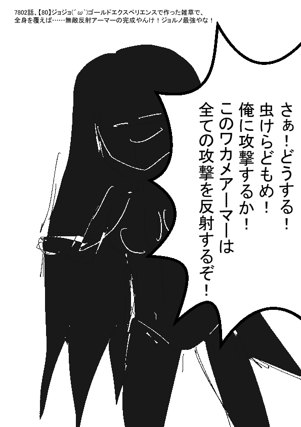 【80】ジョジョ (´ω`)ゴールドエクスペリエンスで作った雑草で、 全身を覆えば……無敵反射アーマーの完成やんけ!ジョルノ最強やな! |